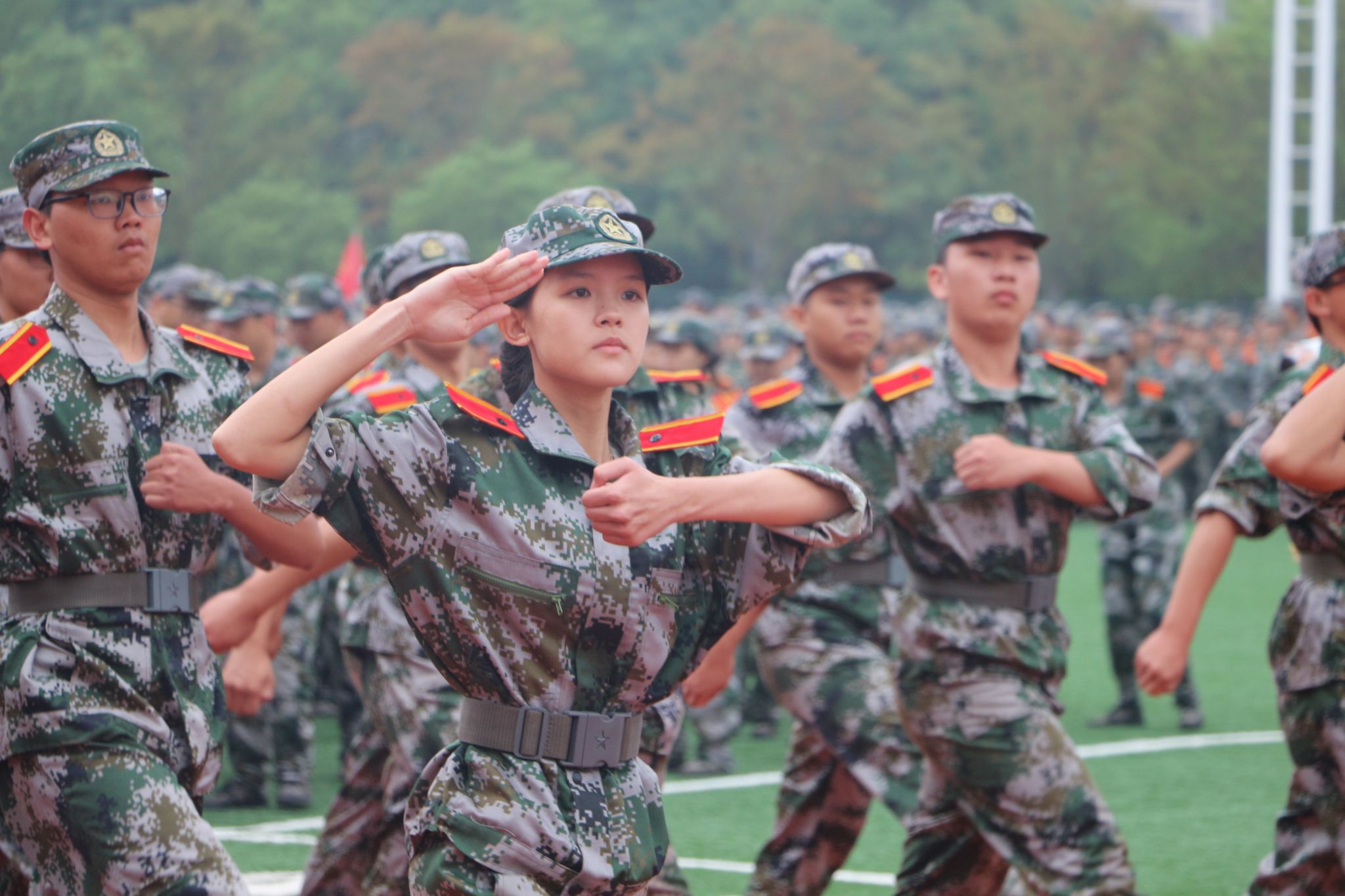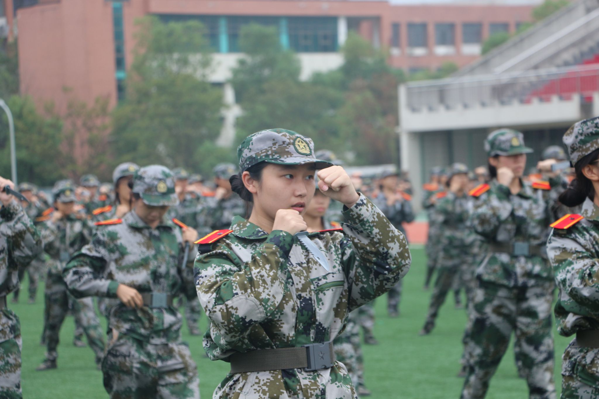 首先登场的是军体拳方阵,只见同学们英姿飒爽,行动间苍劲有力,干净利落,口号嘹亮。随后进行汇报演出的是女子匕首操队伍,她们个个手握匕首,眼神犀利,一招一式间尽显飒爽英姿。